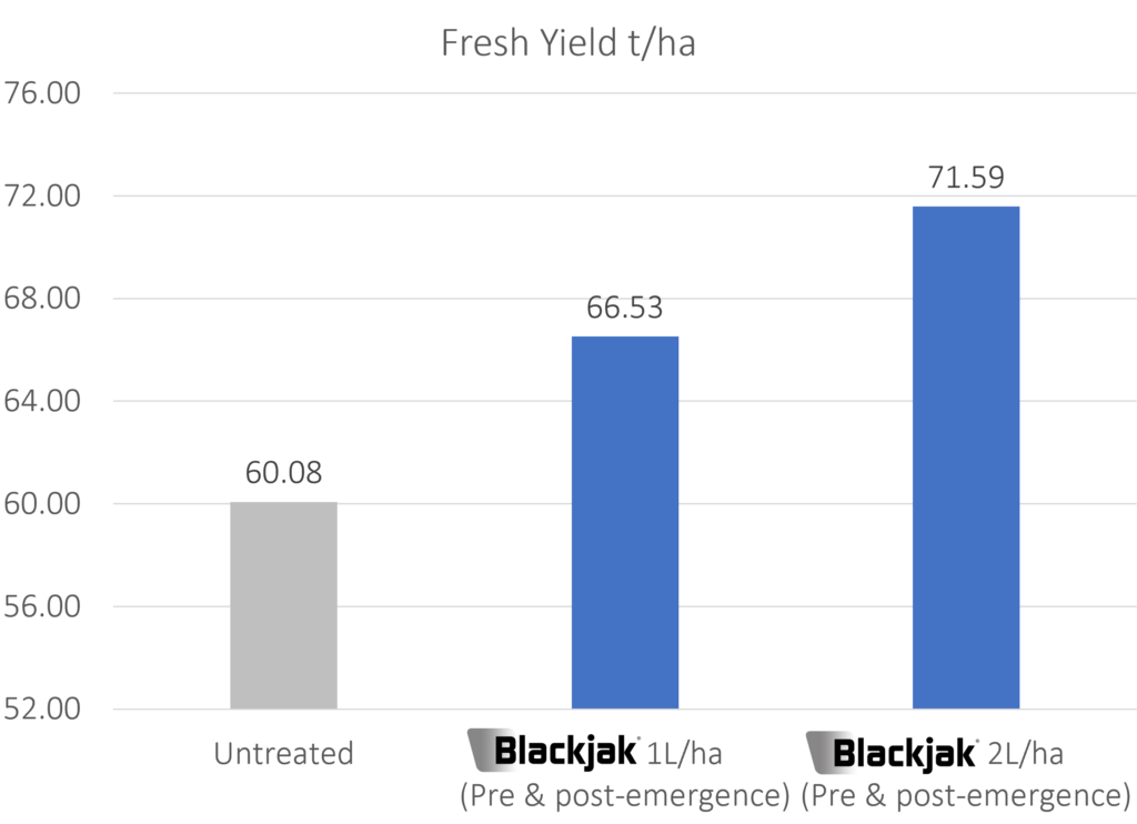 The below trials data, taken from Ireland shows that including Blackjak at 2 x 1L/ha, pre-emergence and early post-emergence increased fresh yield by over 6t/ha and when used at the recommended 2 x 2L/ha Blackjak increased yield by over 11.5t/ha